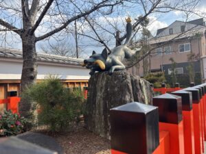 楼門前には阿吽(あうん)の狐の像が鎮座し、向かって右は「玉」左は「鍵」をくわえています。