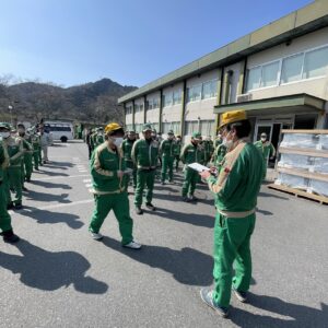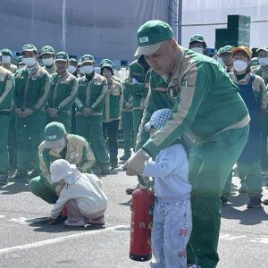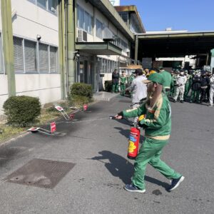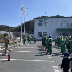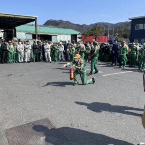 2026年3月12日 岡山工場消防訓練 2026.03.16 Blog 3月12日 岡山第一工場と第二工場で消防訓練を行いました。 仮想の火点を決め、避難誘導・通報(119番)・初期消火ですが 例年同じ訓練だったんですが、今年は両工場とも避難完了のタイムが遅く 今後の課題と感じました。(緊張感がなかった) 第二工場ではひなた保育園のにじ組6人と保育士さんが参加しました。 工場へ務めている従業員のお子さん達が「じーじ」「かーか」と水消火器の 放水も体験しました。 前の記事へ